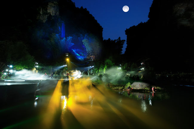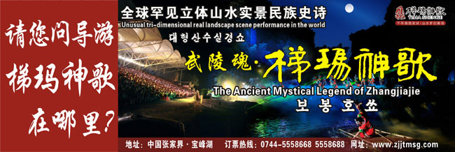 The Ancient Mystical Legend of Zhangjiajie 《武陵魂•梯瑪神歌》是一場記述土家族起源、演變、戰(zhàn)爭、生產(chǎn)生活等內(nèi)容的大型立體山水實(shí)景演出,揉合了音樂、舞蹈、文學(xué)等多種藝術(shù)形式,如幻如夢的舞美燈光,搖曳生姿的原生態(tài)歌舞……濃縮了土家族數(shù)千年的發(fā)展歷史,400多名演員以自然淳樸的表演充分的展示了土家的民族文化特征,給游客帶來了耳目一新的感受。一場視聽的饕餮盛宴,一曲驚天地、泣鬼神的曠世古歌,給人山水文化光影視聽的享受!境銎罚簭埣医缣莠斏窀栉幕瘋鞑ビ邢薰尽