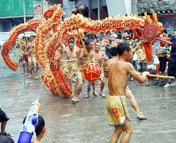 如今已發(fā)展成為對(duì)喜慶節(jié)日的慶祝,對(duì)美好生活祝福的一種方式。它用鮮棕葉作龍須,用葛藤、黃荊條、松樹枝作龍身,分9節(jié)、11節(jié)、1 3節(jié)、15節(jié)等不同長度的奇數(shù),由9至15人參加舞龍。伴著鑼、鼓、鎖吶的鏗鏘樂曲,一人持“寶”在前,龍舞歡騰時(shí)有“二龍搶寶”、“蛇蛻皮”、“烏龍絞柱”等50多種動(dòng)作玩法。與此同時(shí),身著民族服裝的群眾用臉盆、水瓢、銻桶等容器端水圍繞著龍潑澆,這樣邊舞邊潑水、水潑得越多龍舞得越歡,也預(yù)祝大家當(dāng)年風(fēng)調(diào)雨順,五谷豐登,其場面歡樂喜慶,風(fēng)趣幽默。已列入我市第一批非物質(zhì)文化遺產(chǎn)保護(hù)名錄。