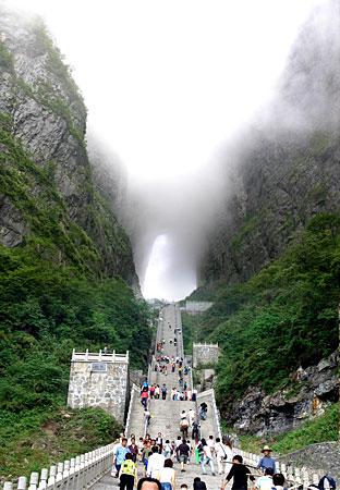 選擇乘索道游覽天門山是最佳視角。索道吊廂一出站房,馬上就騰空飛了起來(lái),從城市的一棟棟樓頂掠過(guò),猶如在城市上空滑翔。翻過(guò)一道山梁之后,城市被遠(yuǎn)遠(yuǎn)拋在了視線以外,大片翠綠的稻田映入眼簾,透過(guò)打開(kāi)的通風(fēng)窗口,一陣陣青草水田特有的清香沁入心脾;蚋呋虻偷霓r(nóng)舍不時(shí)從我們身下滑過(guò),牛羊們?nèi)齼蓛捎崎e的在田間浮動(dòng)著,靜謐、安詳。再翻過(guò)一座山峰,我們便立即被滿山的青翠所包圍,萬(wàn)仞絕壁也已投懷送抱。索道支架矗立于絕壁天險(xiǎn)中,或挺立或傾倒或探頭或擁抱,我們繼續(xù)在艱險(xiǎn)中游歷,時(shí)而隱沒(méi)于云堆,時(shí)而出世于蒼穹。這時(shí)你除了那滿懷的驚險(xiǎn)刺激外有的便只有望索而興嘆了。我拍了很多片子,但是總覺(jué)得還是沒(méi)有足以記錄下來(lái)這座空中盆景的壯麗。