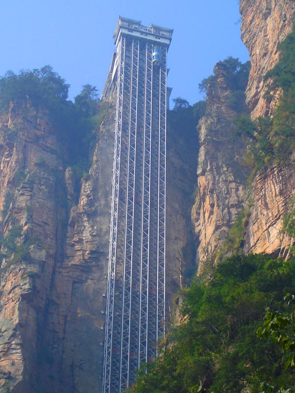 百龍?zhí)焯?BR>    百龍?zhí)焯荩怪备卟?35米,運(yùn)行高度326米,由154米山體內(nèi)堅(jiān)井和172米貼山鋼結(jié)構(gòu)井架等組成,采用三臺(tái)雙層全暴露觀光電梯并列分體運(yùn)行,每臺(tái)次載客50人次,運(yùn)行速度3米/秒,三臺(tái)同時(shí)運(yùn)行每小時(shí)往返量達(dá)4000人次。百龍?zhí)焯莸男藿▽?shí)現(xiàn)“山上游,山下住”的目標(biāo),提供了交通保障,將袁家界天下第一橋、迷魂臺(tái)、天懸白練以及烏龍寨、楊家界等絕世美景從幕后推向了前臺(tái),并將天子山、袁家界、金鞭溪等精品旅游線(xiàn)路連為一體,解決了多年困擾景區(qū)的交通瓶頸問(wèn)題。