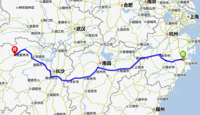 臨海去張家界自駕車自助游線路圖全程高速):