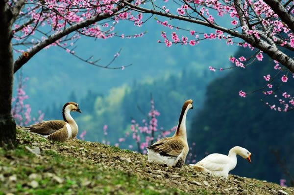 桃之夭夭,灼灼其華。據(jù)了解,天子山這處桃花仙境位于神堂灣至大觀臺之間的一農場山丘內,面積足有一百畝以上。由于該地段剛好處于天子山至高點,因此極目遠眺,峰林風光、桃花美景盡收眼底。而盡管農場,則是一派鄉(xiāng)村田園風情,一群雞鴨鵝不時穿梭在桃樹林內,一邊尋覓食物,一邊享受春光;看家護院的小黃狗迎接游客的熱情叫聲,讓人頓生回歸鄉(xiāng)愁之感。